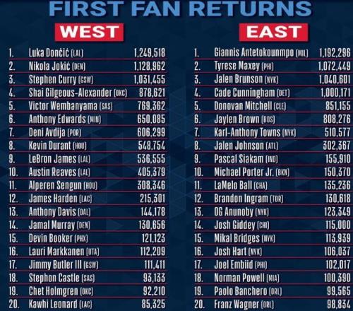 全明星首轮投票结果:詹姆斯仅排名西部第九,东契奇西部第一! -